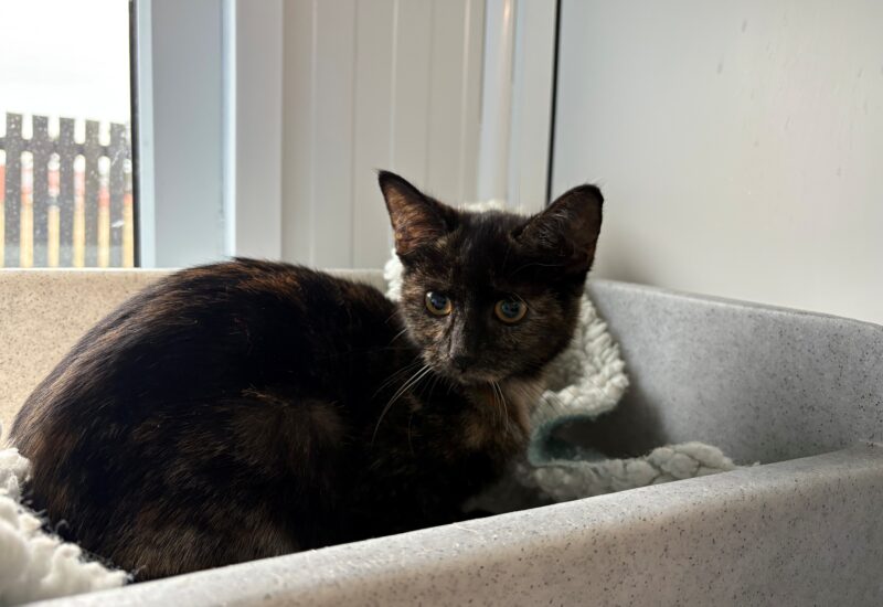Maple is a naturally timid and nervous kitten who often seeks comfort in hiding. The shelter environment has been overwhelming for her so far, and she reacts cautiously with new people. While she tolerates being picked up, she doesn’t particularly enjoy it — instead, she prefers to build trust slowly and seek affection in her own time.